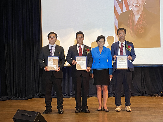 南加州中华科工学会前会长颜利平(左1)和新任理事蒋红涛博士(右1)颁发中学生科技论文竞赛(STEAM Essay Contest )优胜者奖
